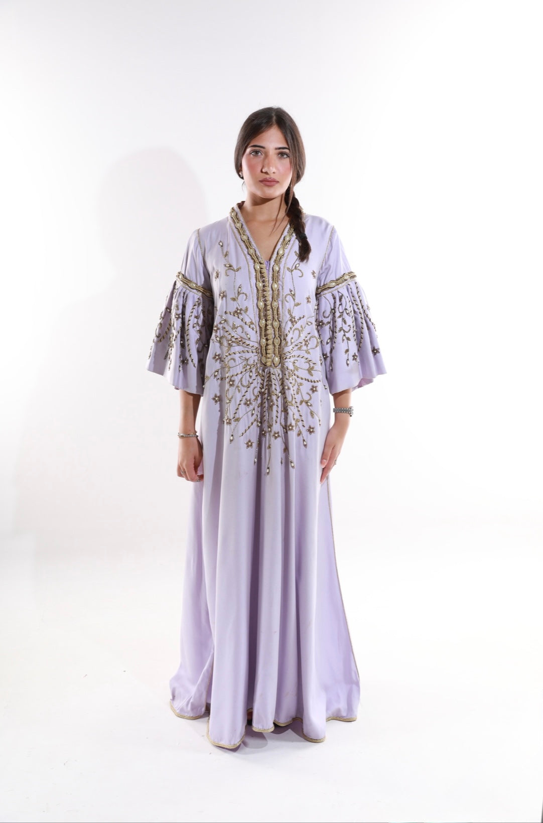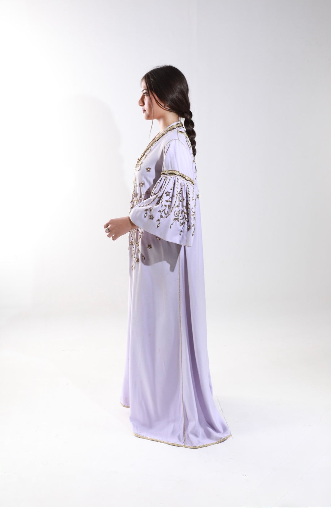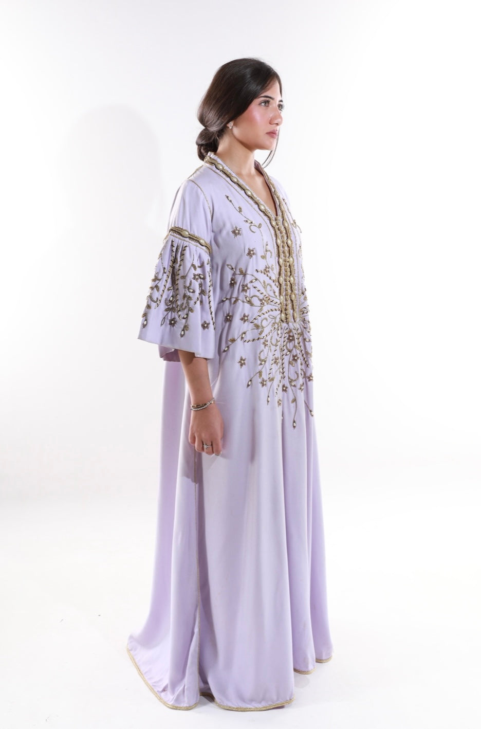 Lilac kaftan with gold embroidery and dramatic flared sleeves for a regal look.