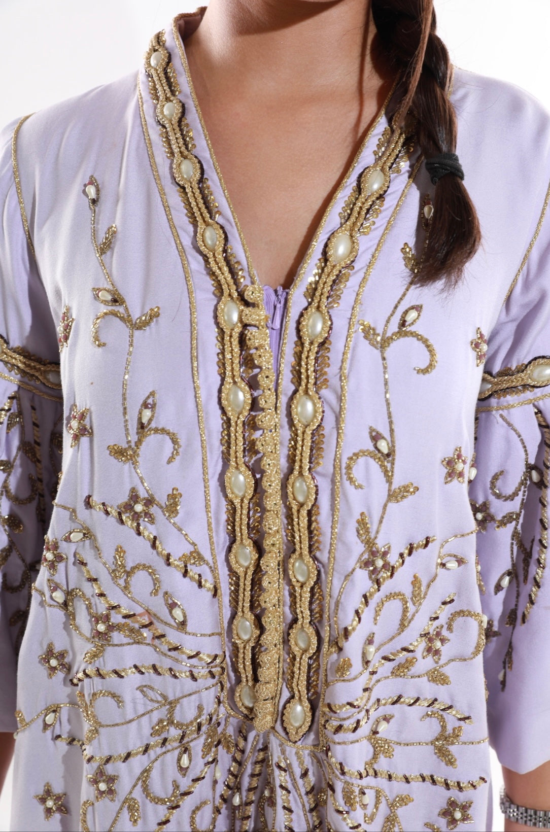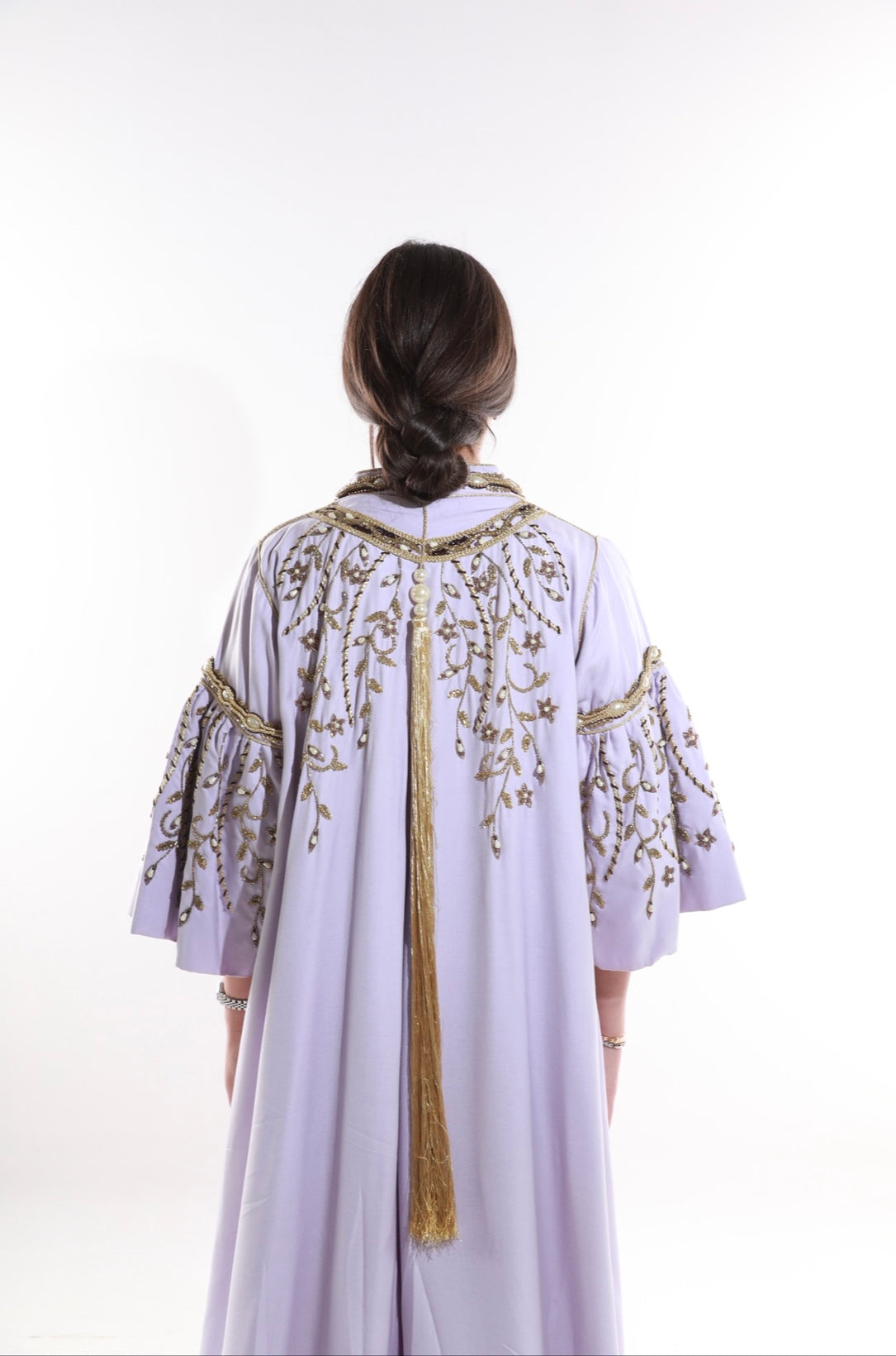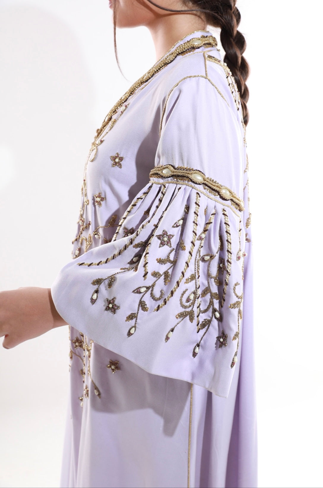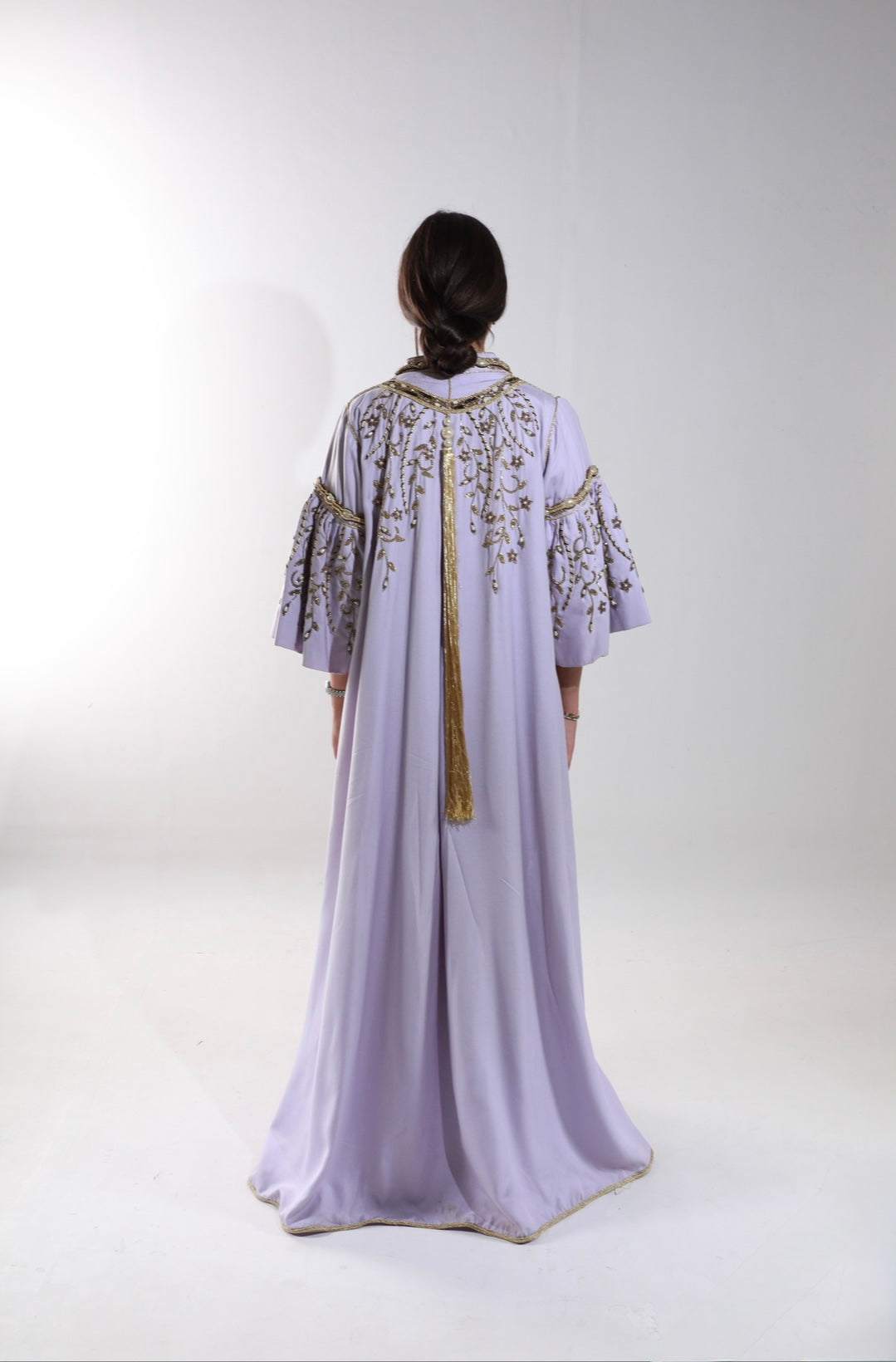 Lilac kaftan with gold embroidery and dramatic flared sleeves for a regal look.